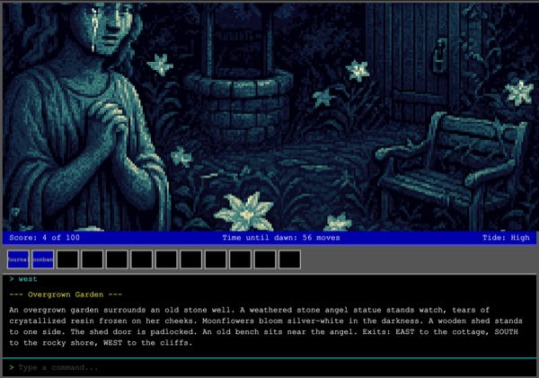 The Enchanted Lighthouse — Generated by Claude, shared by Ethan Mollick from a simple make-a-Sierra-game prompt. I have not played it all the way through — but think I quickly found some weird inconsistencies in what verbs work on objects. But I always struggle with this anyway in these types of parser games.