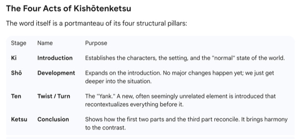 Lincoln Michel on why Plot isn’t a 4 Letter Word. I didn’t know about the Kishōtenketsu concept of plotting before, so this was a good find for me. It relies on contrast and surprise, instead of the idea of more rigid structural beats and curves. From Gemini Pro Research helping me out: