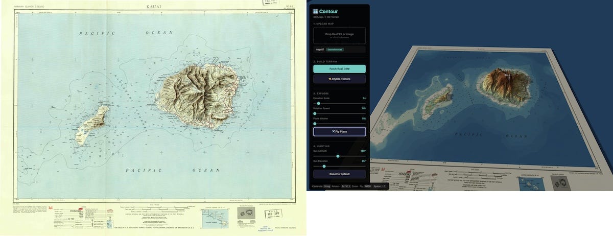 Contour — Convert 2D maps to flyable 3D terrain. I want to try this with historical maps… this was a hackathon with Gemini 2nd place winner.