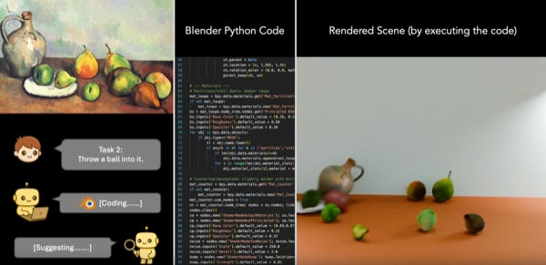 😂 VIGA — Vision-as-Inverse-Graphics Agent via interleaved multimodal reasoning. Basically: images to Blender 3D. Ok, lol. “Can I get a 3d scene from this and then throw a ball into it.” Sure, why not. Screen grab during the ball knocking everything over:
