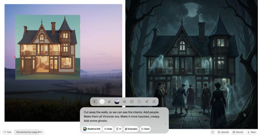 Krea.AI real-time image edit. This is not the first one of these (although people keep forgetting it was possible years ago, and I’ll allow it cause it’s still so much fun)…. But you can “direct” image to image in real time as you type. It’s fast enough that I saw some people effectively streaming video frames, for a video2video effect—which admittedly makes it faster than the previous versions. I went from a generated collage on the left in various stages to the one on the right… The video isn’t as entertaining as I hoped, but they have helpfully added a “record” button to your generation session.