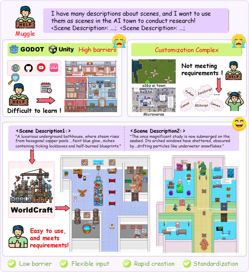 World-Craft — 2D “game” world generation arranged tilemaps, i.e. a model that arranges them for you using assets from the Modern Series on itch (which I’ve purchased as have many). “World Craft is an agentic world creation framework designed to democratize the creation of executable and visualizable AI simulations (e.g., AI Town). … World Craft allows users to create complex, dynamic game scenes simply through textual descriptions, without requiring any programming expertise.” To be honest, the examples are nowhere near as lovely as a custom authored tilemap, but those indeed take a ton of time and skill to produce even using nice purchased assets. I know first hand.